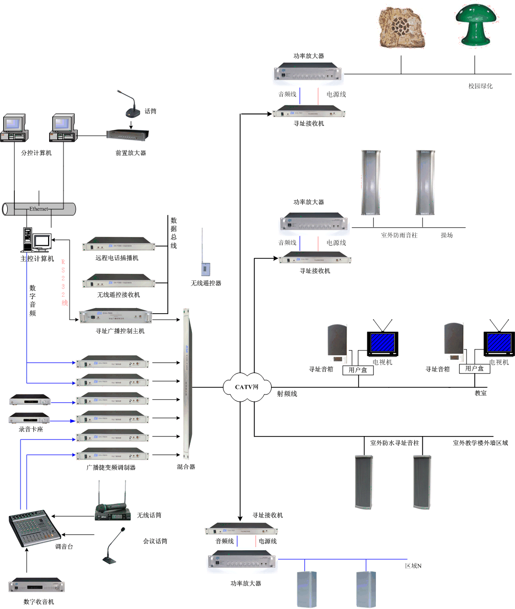 本系統(tǒng)最大的特點就是把現(xiàn)在使用的廣播系統(tǒng)通過科技論證,采用科學(xué)的手段,把音頻調(diào)制、定壓功放、地址編碼、音頻混合、控制信號、遠(yuǎn)程遙控、多路輸出等多種功能有效的結(jié)合在一體,通過一根有線電視線網(wǎng)傳輸?shù)矫恳粋角落。從而實現(xiàn)系統(tǒng)只需要一臺廣播主機實現(xiàn)多種廣播任務(wù),無極限擴充,性能更加穩(wěn)定,更加人性化,更有利于產(chǎn)品在各個領(lǐng)域里的推廣和應(yīng)用。真正實現(xiàn)了從教室到操場一網(wǎng)到底、多網(wǎng)合一的強大功能。
